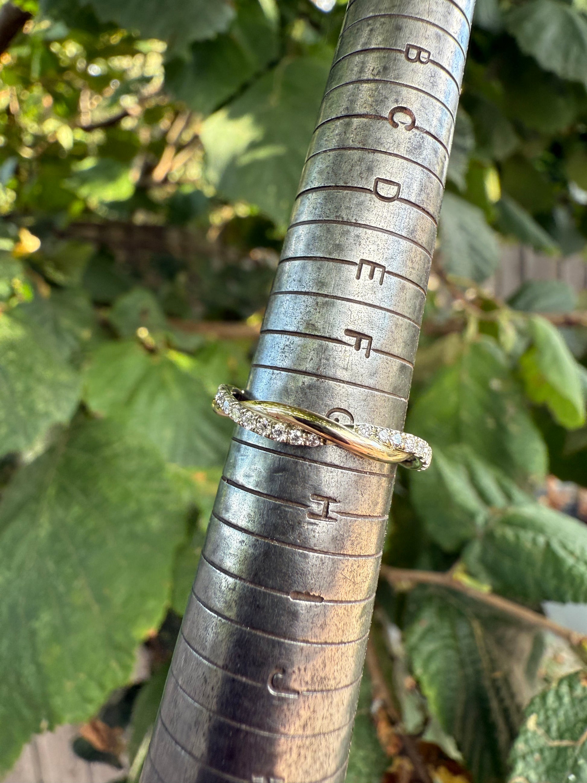 Our Yellow & White Gold Twisted Diamond Ring is a delight. The diamonds sit within small neatly aligned claws that create the delicate the look of this ring. The twisted yellow and white gold wire goes all the way around, whilst the diamond cover 2/3rds.